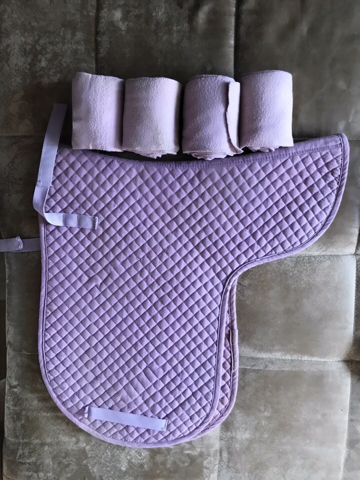 Выездковый вальтрап трилистник, не плотный, хорош для работы летом и комплект флисовых бинтов, липучки в идеальном состоянии, для работы верхом, надевали пару раз, цвет лиловый